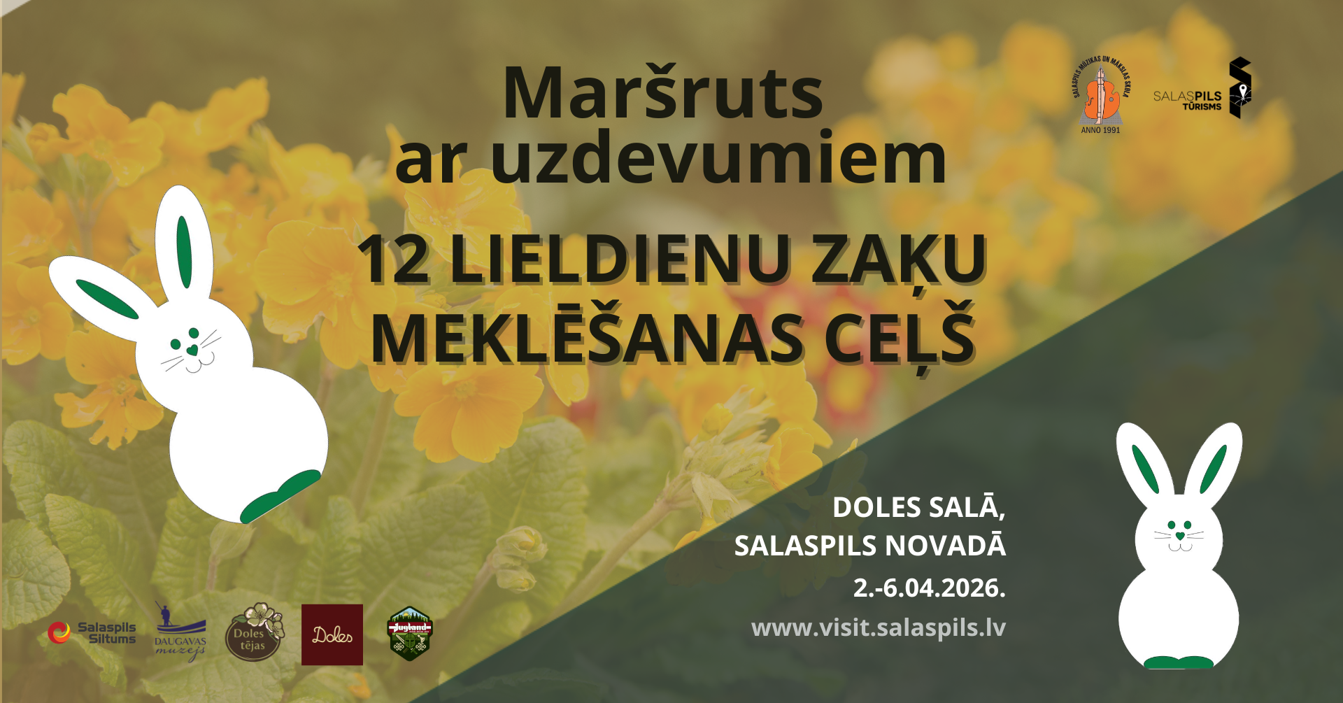 Doles sala Salaspils novadsLieldienu brīvdienās Doles salā izveidots orientēšanās maršruts “12 Lieldienu zaķu meklēšanas ceļš”. Maršrutā izvietoti 12 Lieldienu zaķi. Dalībniekiem tie jāatrod ....