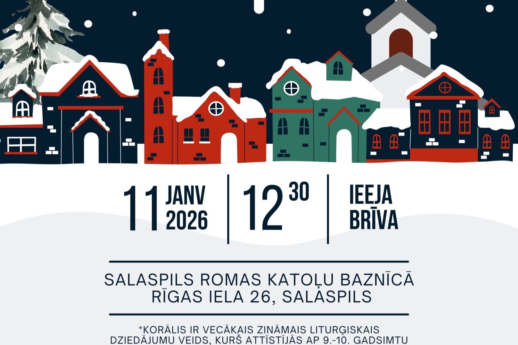 11. janvārī plkst. 12.30 Salaspils Romas katoļu baznīcā norisināsies pūtēju orķestra “Salaspils” Ziemassvētku izskaņas koncerts “Korāļi pār Salaspili”, kur senie korāļi un pūtēju orķestra skanējums satiksies mierpilnā svētdienas pēcpusdienā.
