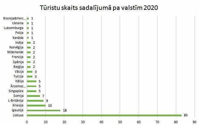 Lai arī 2020. gadā bija dažādi ceļošanas ierobežojumi, Salaspils novadu apmeklēja arī ārvalstu tūristi – 4% no kopējā apkalpoto klientu skaita gadā (skat. 1. attēlu). Pie TIC visvairāk vērsās ceļotāji no kaimiņvalsts Lietuvas – 50% jeb puse no visu ārvalstu apmeklētāju skaita gadā. Interese par Salaspils novada tūrismu bija arī ceļotājiem no Igaunijas, Krievijas, Apvienotās Karalistes un Somijas. Tālākie ciemiņi bija ieradušies no Singapūras Republikas, Indijas un Kanādas (skat. 2. attēlu).