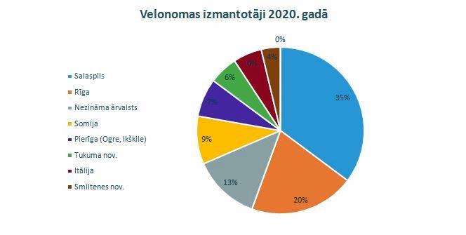 Aktīvajā periodā, no jūnija līdz septembrim, cilvēki izmantoja iespēju nomāt velosipēdus. Šo pakalpojumu visvairāk izmantoja vietējie salaspilieši – 35% no kopējā velo nomātāju skaita. Velosipēdus nomāja arī pilsētas viesi no Rīgas – 20% no kopējā velosipēdu nomātāju skaita aktīvajā sezonā. Neizpalika arī nomātāji no Pierīgas, Vidzemes un Zemgales. Šo pakalpojumu izmantoja arī ārvalstu viesi no tādām valstīm kā Somijas un Itālijas (sk. 3. attēlu).